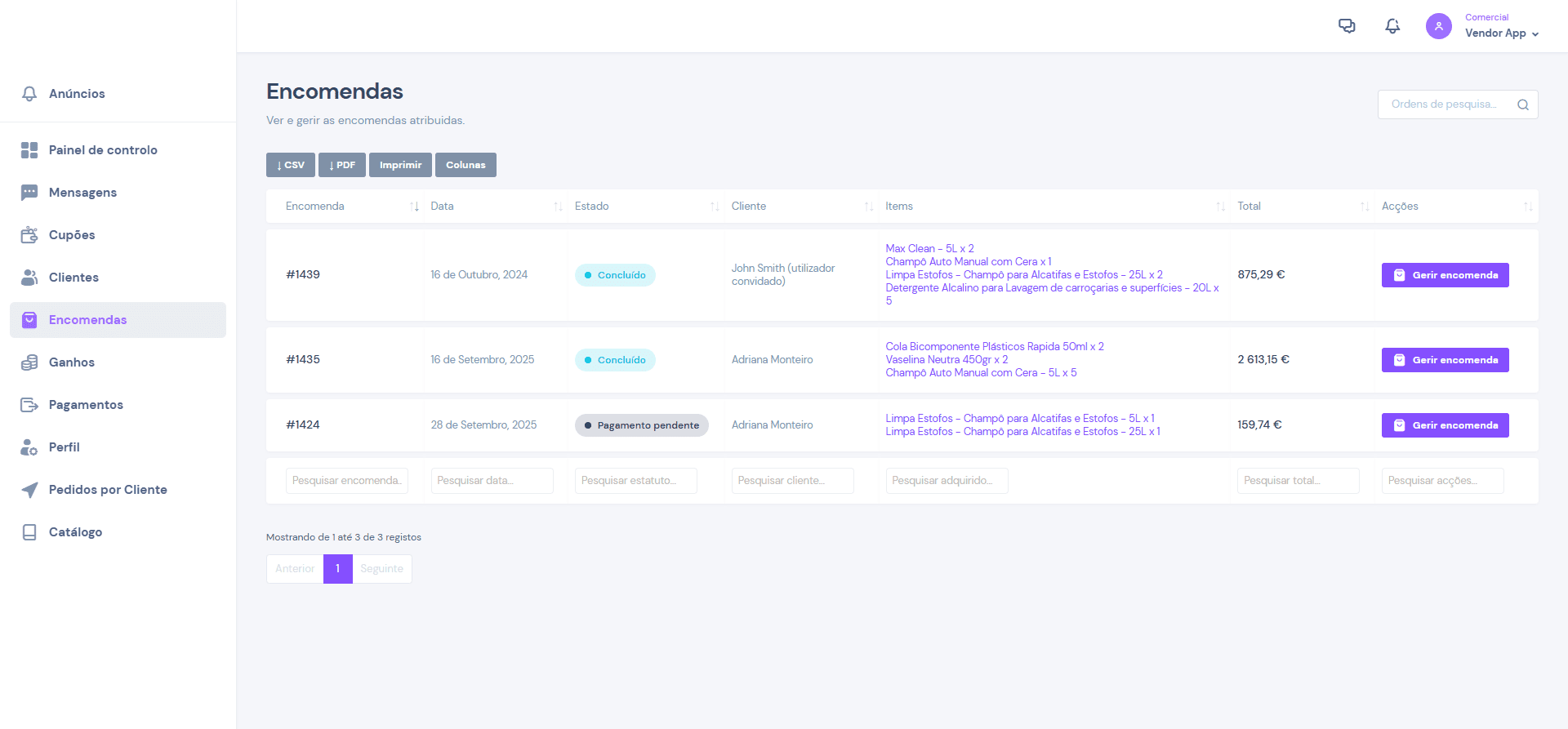 Permite gerir os clientes e historico das encomendas e produtos adquiridos.