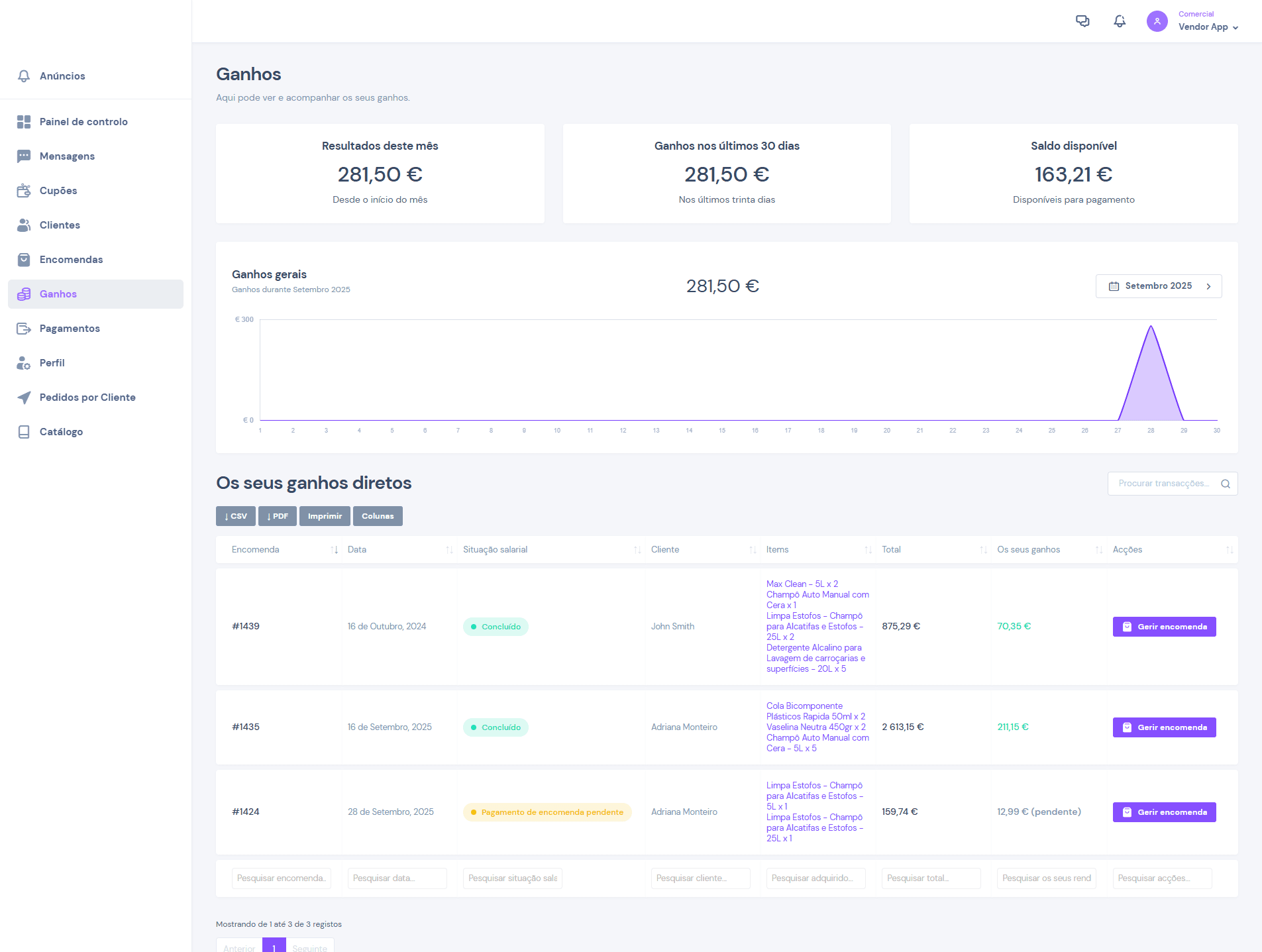 Pode ainda atribuir comissão sobre as vendas personalizadas a cada agente de vendas, com controlo de registos e valores creditados.